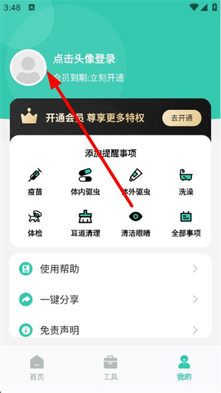 2、进入我的页面后,找到并点击上方的头像登录区域。