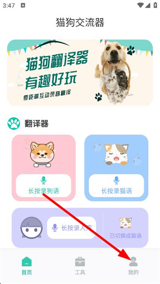 1、打开猫狗交流器App,点击页面底部右侧我的选项。