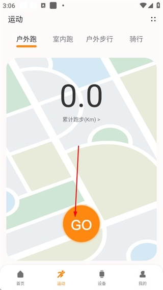 2、进入运动页面后,确认选择户外跑模式,点击页面中间的GO。
