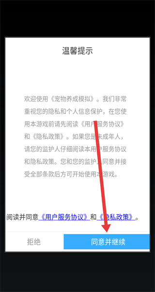 1、在温馨提示弹窗中,点击同意并继续,确认接受《用户服务协议》和《隐私政策》后进入。