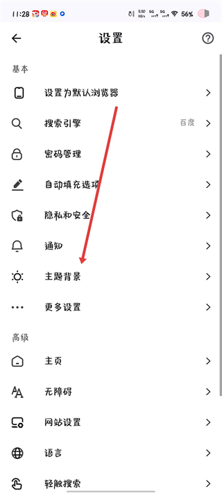 3、在设置界面里找到主题背景选项,点击进入页面。