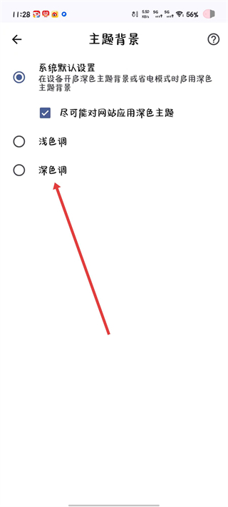 4、在主题背景页面中,选择深色调对应的单选按钮。