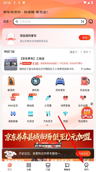 1、在京东养车首页底部,点击我的选项,点击进入我的页面。