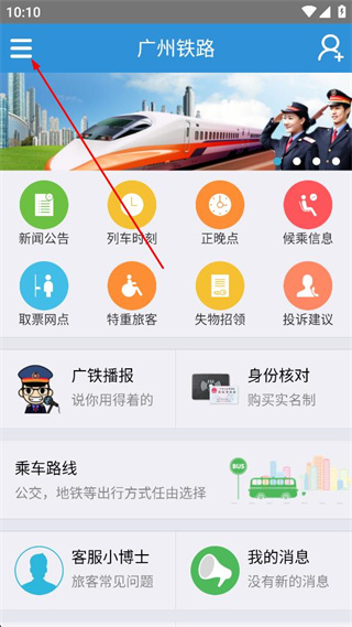 1、在广州铁路首页找到左上角的菜单按钮,点击该按钮,展开功能选项列表。