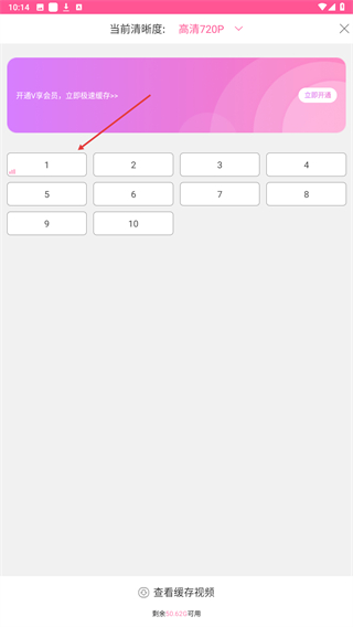 3、在缓存界面中,确认当前清晰度,同时选择想要缓存的剧集集数点击即可。