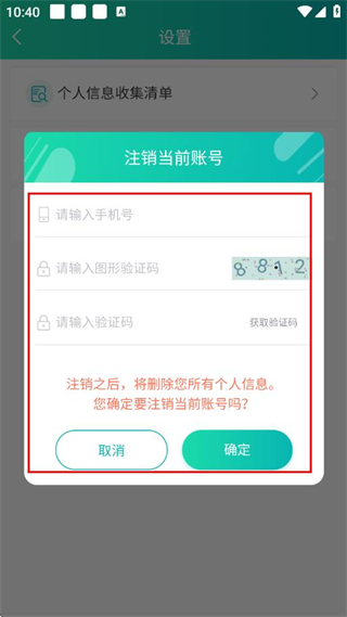 4、在注销当前账号的弹窗中,填写手机号、图形验证码、短信验证码,点击确定。