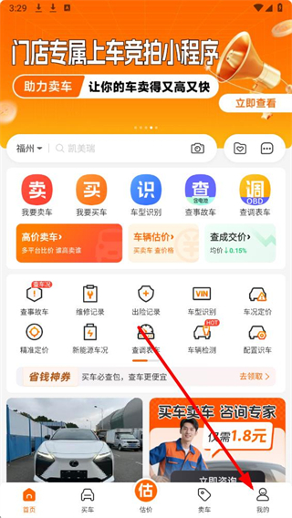 1、在应用首页,点击底部卖车选项,进入卖车相关的功能操作页面。