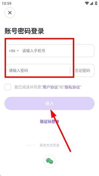 4、输入手机号和密码,点击进入按钮即可完成登录。