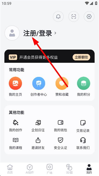 2、进入我的页面后,找到并点击上方注册/登录区域。