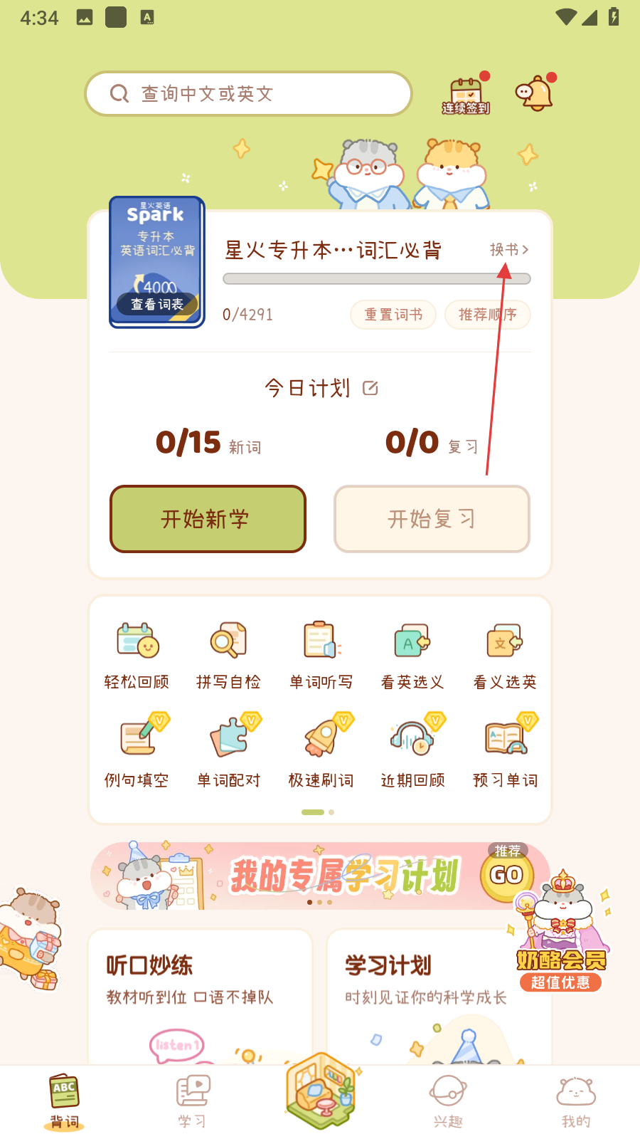 1、打开奶酪单词APP,在背词页面点击当前词书右侧的换书按钮。
