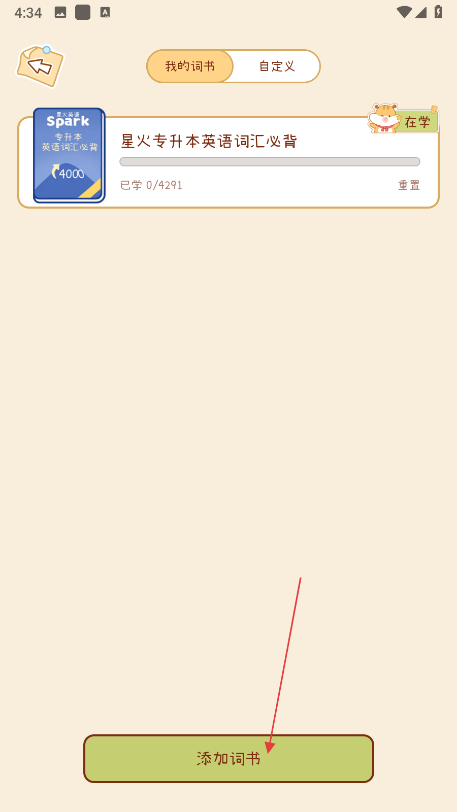 2、进入我的词书界面后,点击页面下方的添加词书按钮。
