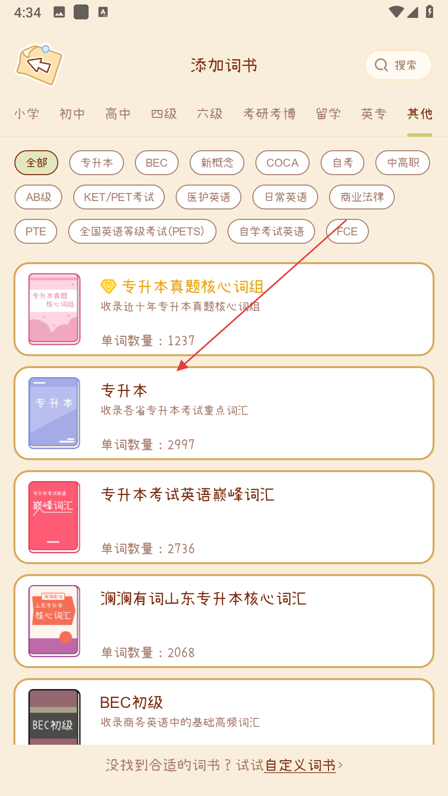 3、在添加词书页面,浏览或搜索找到想要更换的课本,点击该词书。