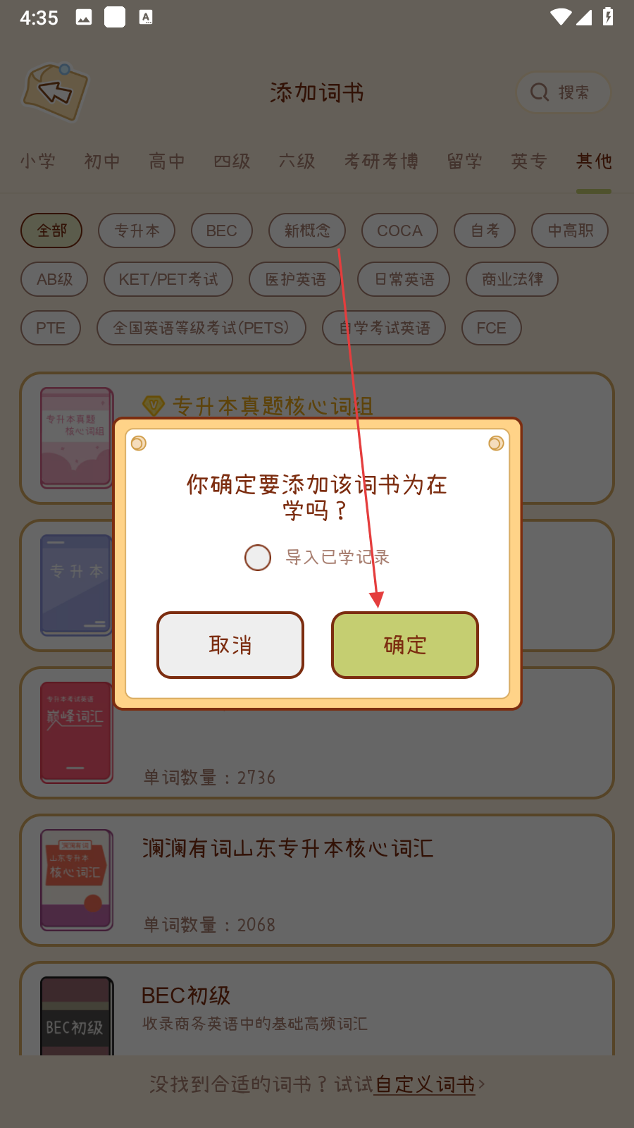 4、在弹出的确认窗口中,点击确定,即可将该课本添加为在学词书。