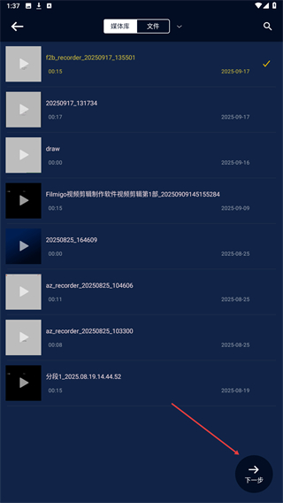 2、在文件列表中选中目标视频后,点击页面右下角的下一步按钮,进入详情操作页面。