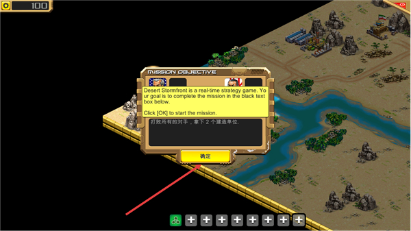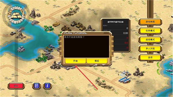1、进入沙漠风暴后,点击任务模式,从首个解锁任务开始挑战,任务目标为打败所有敌军,点击确定进入任务界面,先熟悉屏幕上坦克、基地等核心元素的基础操作。