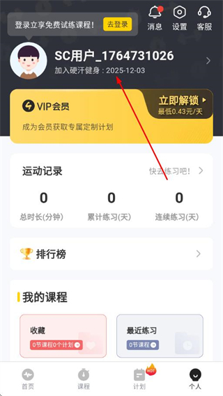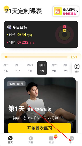 1、打开硬汗健身APP,在首页点击底部导航栏的个人选项。