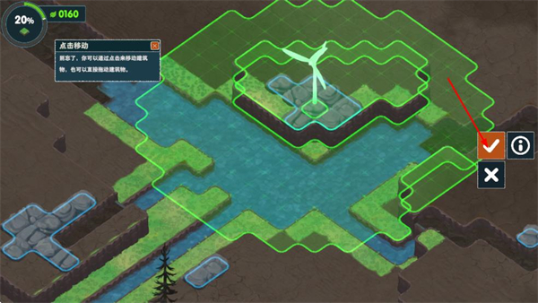 4、根据提示点击移动或放置道具,完成初期的地形改造操作,推进游戏恢复进度。
