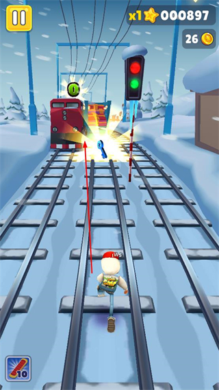2、操控角色在轨道上奔跑,躲避前方出现的障碍物,同时收集沿途的道具。