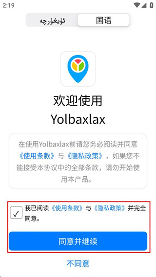 1、勾选已阅读使用条款与隐私政策的选项,点击同意并继续按钮进入登录页。