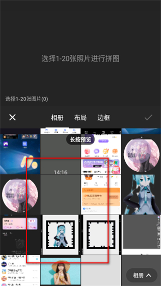 3、进入图片选择界面,挑选1-20张需要拼接的照片并选中。