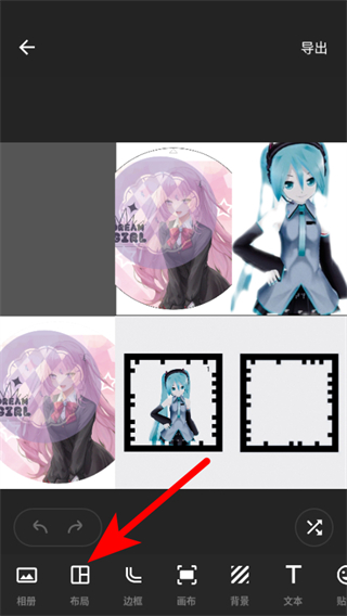 4、选好照片后,可点击底部的布局等选项调整拼图样式,完成后点击导出即可生成拼图。