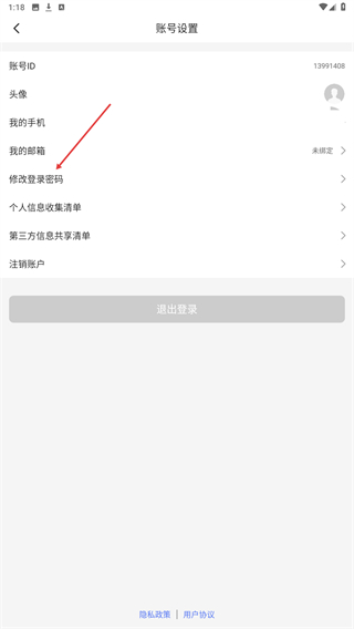 3、在账号设置页面里,点击修改登录密码,弹出操作弹窗。