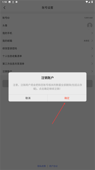 4、弹出注销账户的提示弹窗后,点击弹窗中的确定按钮,完成账户的注销操作。