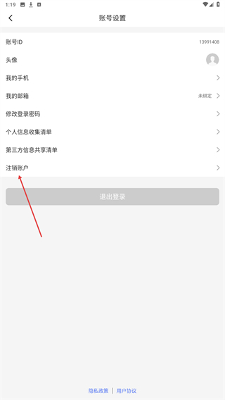 3、在账号设置页面里,找到注销账户选项并点击,触发账户注销的确认弹窗。