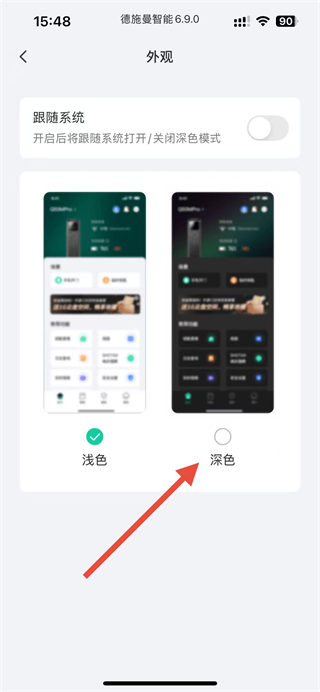 4、在外观页面中,选择深色对应的选项,即可将app切换为深色模式。