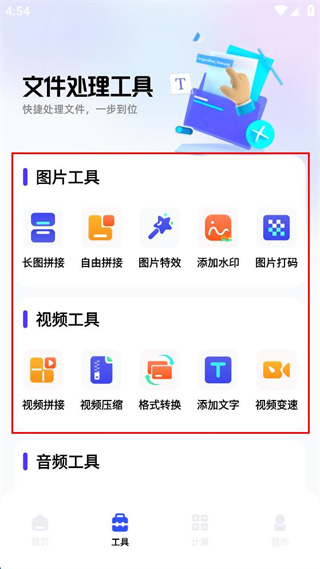 4、登录后点击工具按钮,进入工具页面,可查看图片工具、视频工具、音频工具等功能。