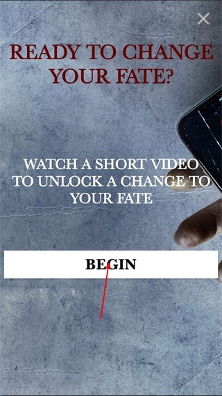 3、在提示界面,点击“BEGIN”按钮,观看短视频以解锁命运改变机会。