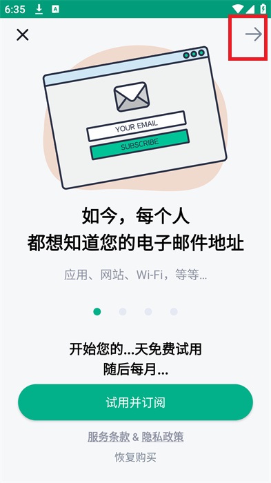 1、打开软件在软件的首页点击右上角的【→】多点几次到达进入的界面,不需要点击【试用并订阅】,点击过后会需要开会员;