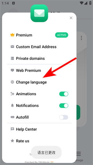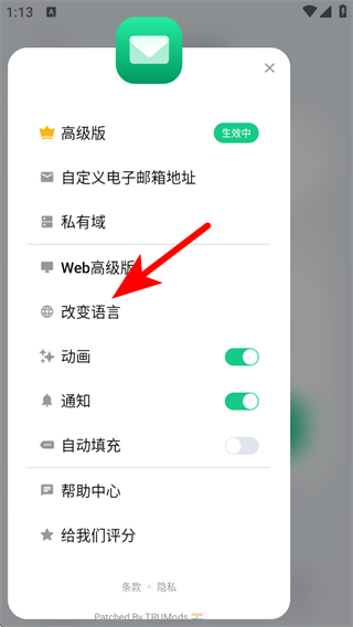 2、在功能选项列表中,点击改变语言,进入语言选择的页面。