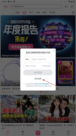 2、在弹出的窗口中,点击密码登录选项,进入账号密码登录页面。