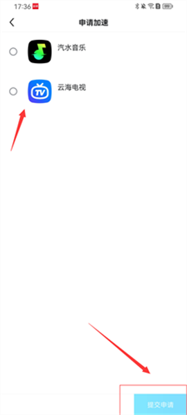 2、接着页面就会出现大家手机中的一些软件、游戏,大家可以选择自己需要加速的软件游戏,点击选中后,点击右下角的【提交申请】即可完成加速,随后就可以直接畅玩啦!