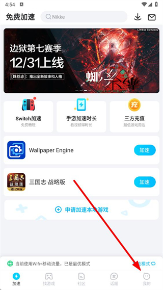 1、在biubiu加速器主界面,点击底部导航栏我的选项,进入个人相关功能页面。