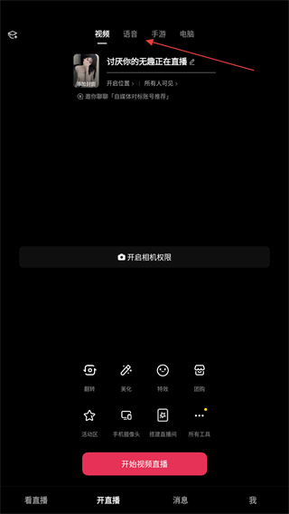 1、这是专门帮助抖音用户进行直播的应用,进入平台之后想要视频、语音、手游、电脑直播都可以进行直播,在设置完各个直播效果之后,就可以点击【开始视屏直播】开启直播;