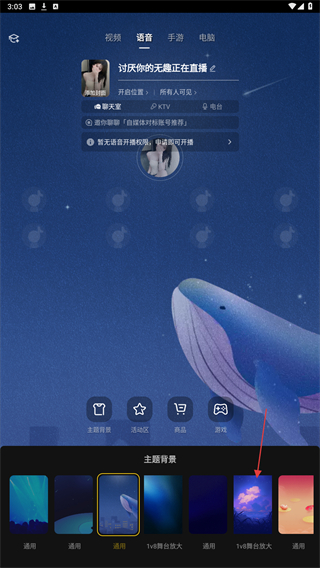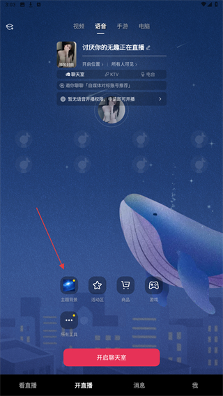 3、在语音直播的设置页面里,找到主题背景相关选项并点击。