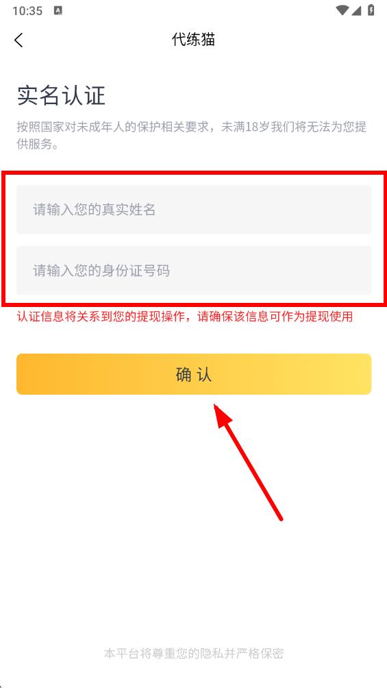 4、进入新页面进行实名认证,在对应输入框填写真实姓名和身份证号码,点击确认。
