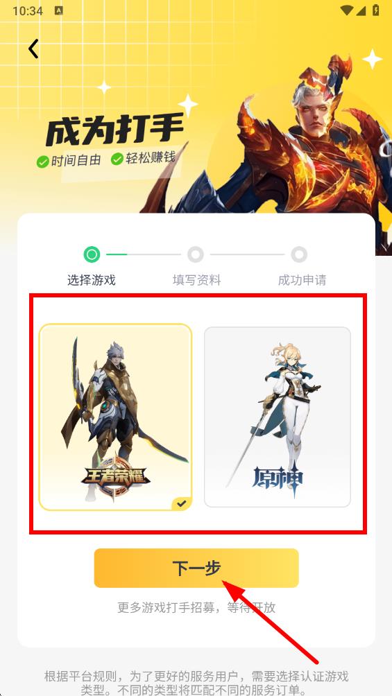 3、在申请页面选择想要代练的游戏,比如王者荣耀或原神,选择后点击下一步。