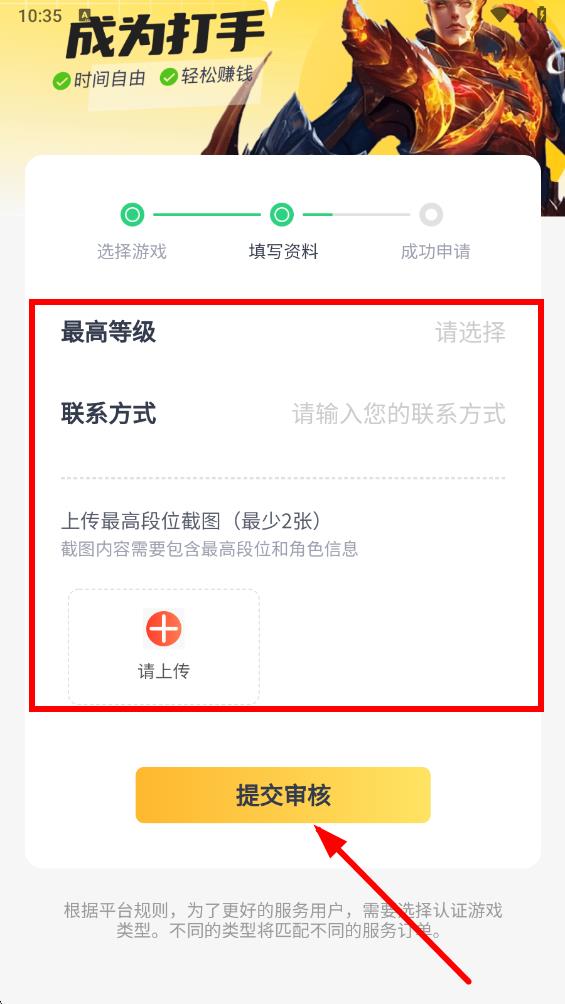 5、随后填写最高游戏等级、联系方式,并上传最最高段位和角色信息的截图,最后点击提交审核,等待平台审核通过即可成为打手。