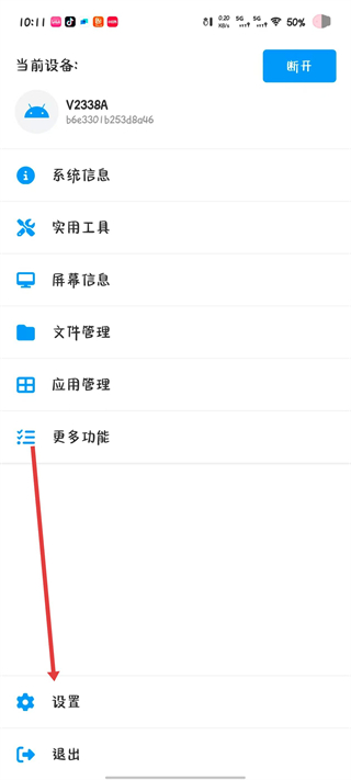 3、在展开的选项中找到设置并点击,进入甲壳虫adb助手的设置界面。