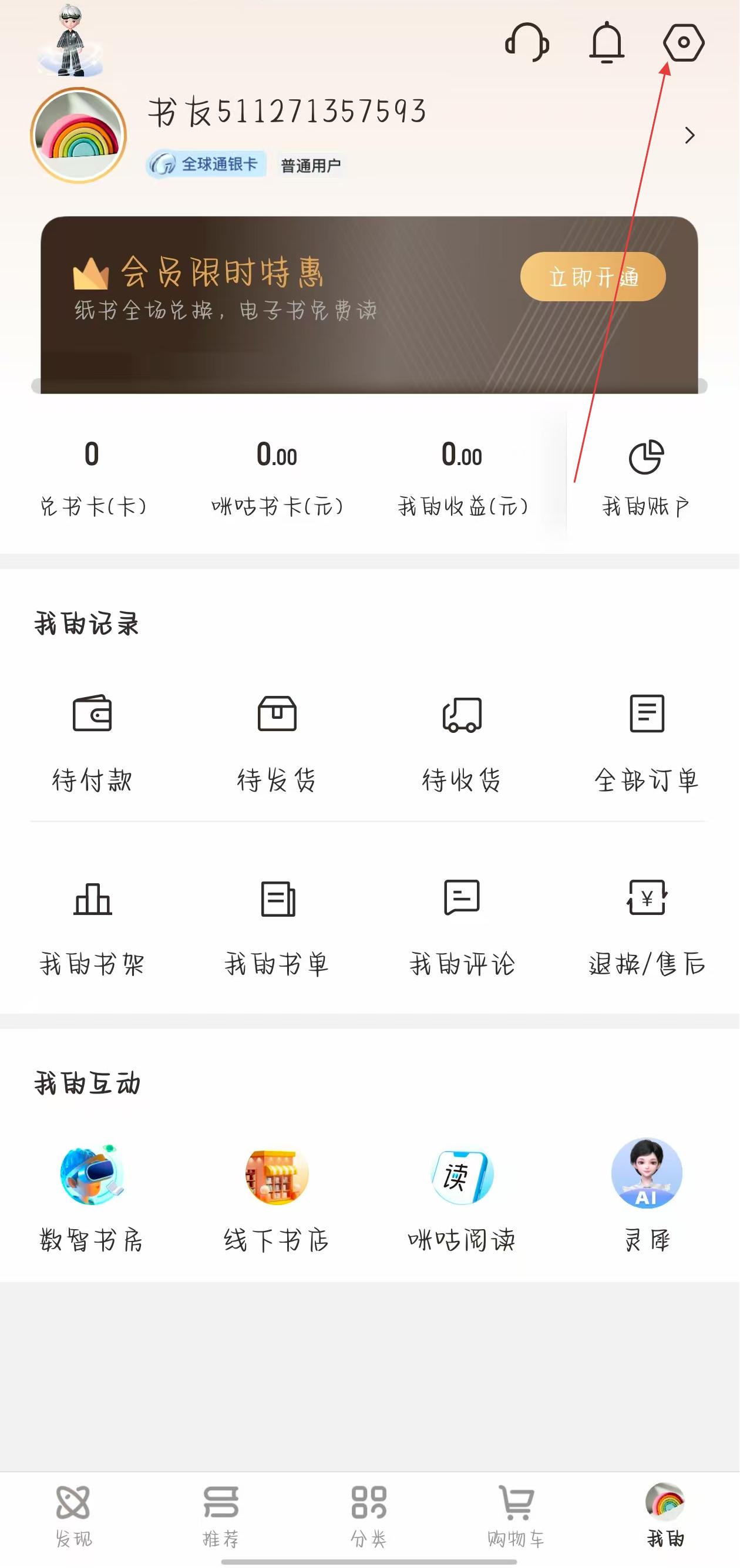 1、打开咪咕云书店APP,点击页面右下角我的,进入个人中心页面。