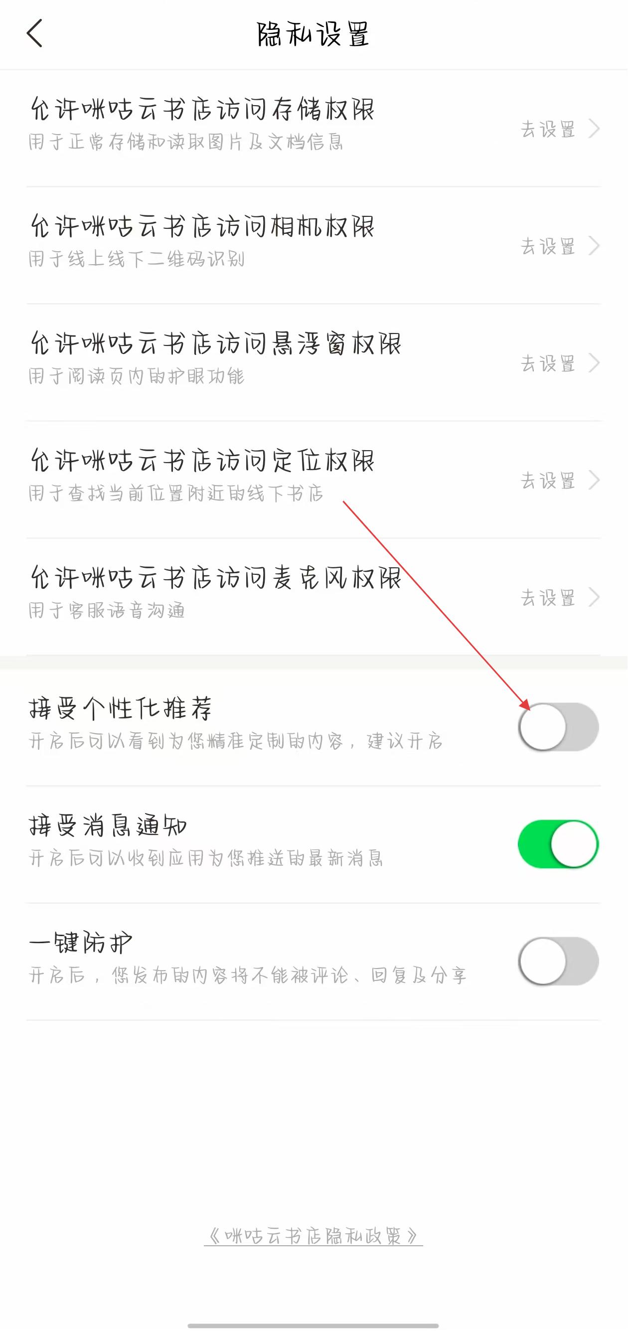 4、在隐私设置页面,找到接受个性化推荐选项,点击其右侧的开关将其开启。