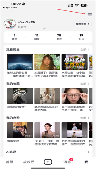2、进入我的界面内,点击右上角三个横线的功能图标。