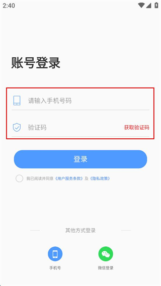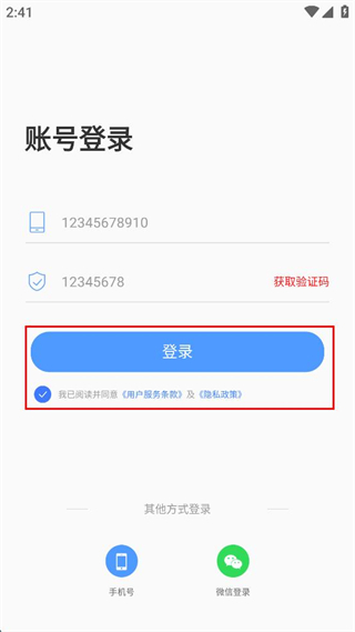 4、在验证码输入框填写获取到的验证码,勾选同意相关条款后点击登录按钮完成操作。
