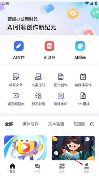 1、打开AI智能办公工具首页,点击页面底部右侧的我的选项,进入个人中心页面。