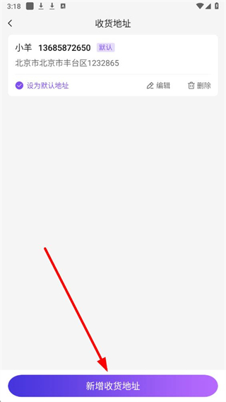 3、在收货地址页面,点击新增收货地址按钮,进入收货信息填写页面。