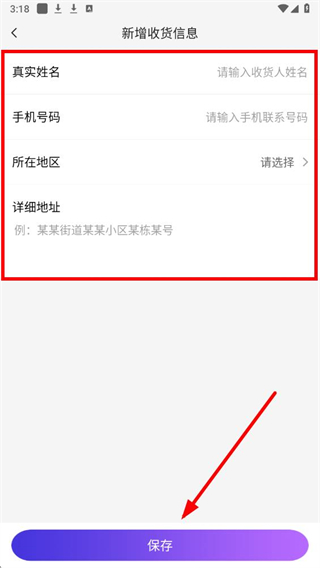 4、在新增收货信息页面,填写真实姓名、手机号码、地区及详细地址,点击保存完成添加。