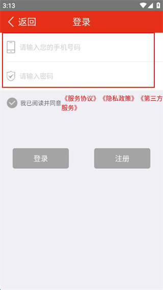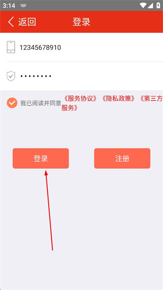 3、在登录页面,依次填写手机号码和密码信息,确认已勾选相关协议的选项。
